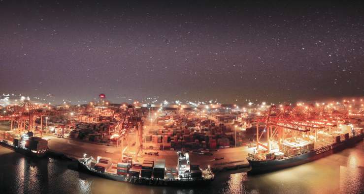 北部湾港之畔,灯火辉煌,巨轮停泊,岸桥林立,机械轰鸣,码头前沿一派繁忙······