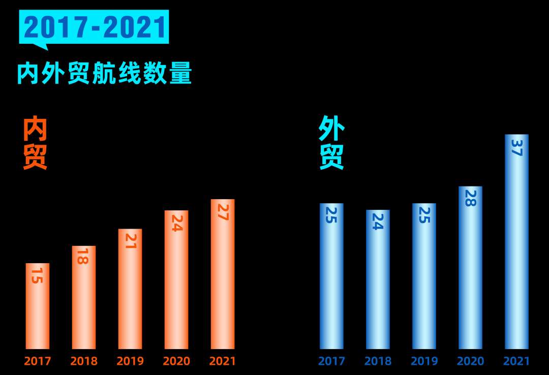 北部湾港集装箱班轮航线数量从2017年40条增至2021年63条,年均增长12%;内贸航线基本实现了全国沿海主要港口全覆盖,外贸航线基本实现了东南亚、东北亚地区主要港口全覆盖,远洋航线由2017年1条增加到2021年7条,通航范围已覆盖全球100多个国家和地区的200多个港口。