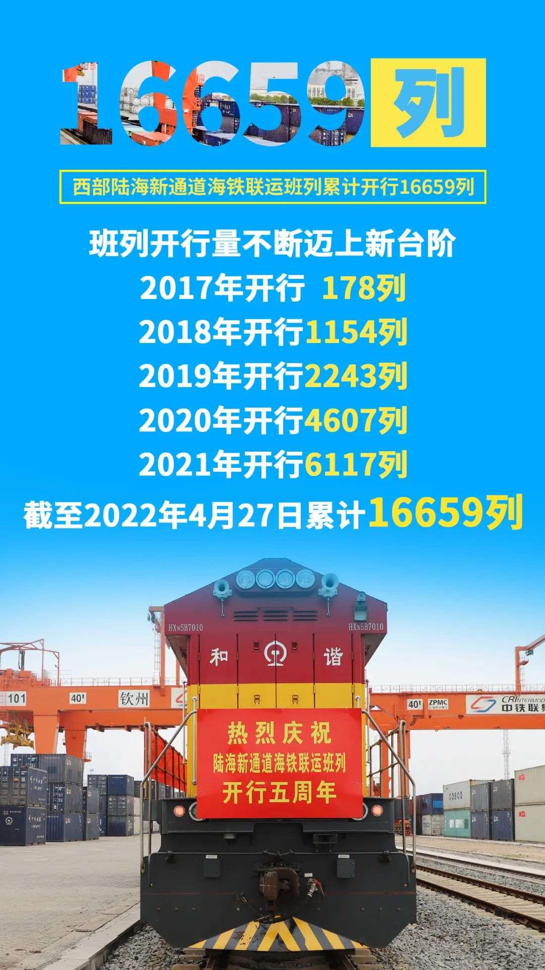 从无到有,从少到多,西部陆海新通道海铁联运班列从2017年的178列增长到2021年的6117列,增长了33倍,服务范围覆盖14省、53市、102个站点。