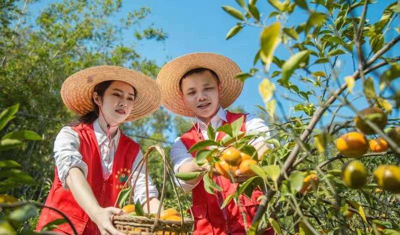 (图为广西农信社金融服务先锋在浦北县龙门镇日新村帮助农户采摘柑果)