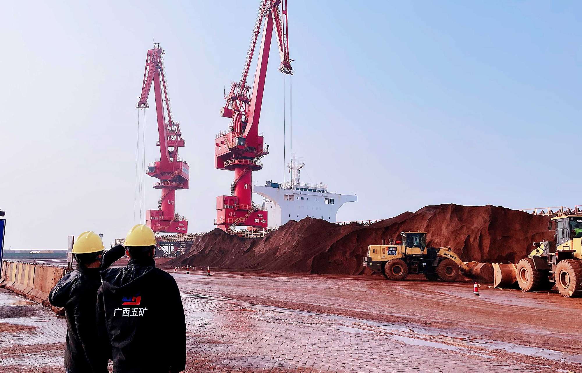 (图为广西宏桂集团五矿公司进口铁矿石在山东日照港卸货现场)