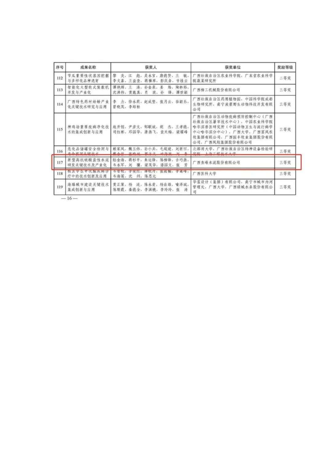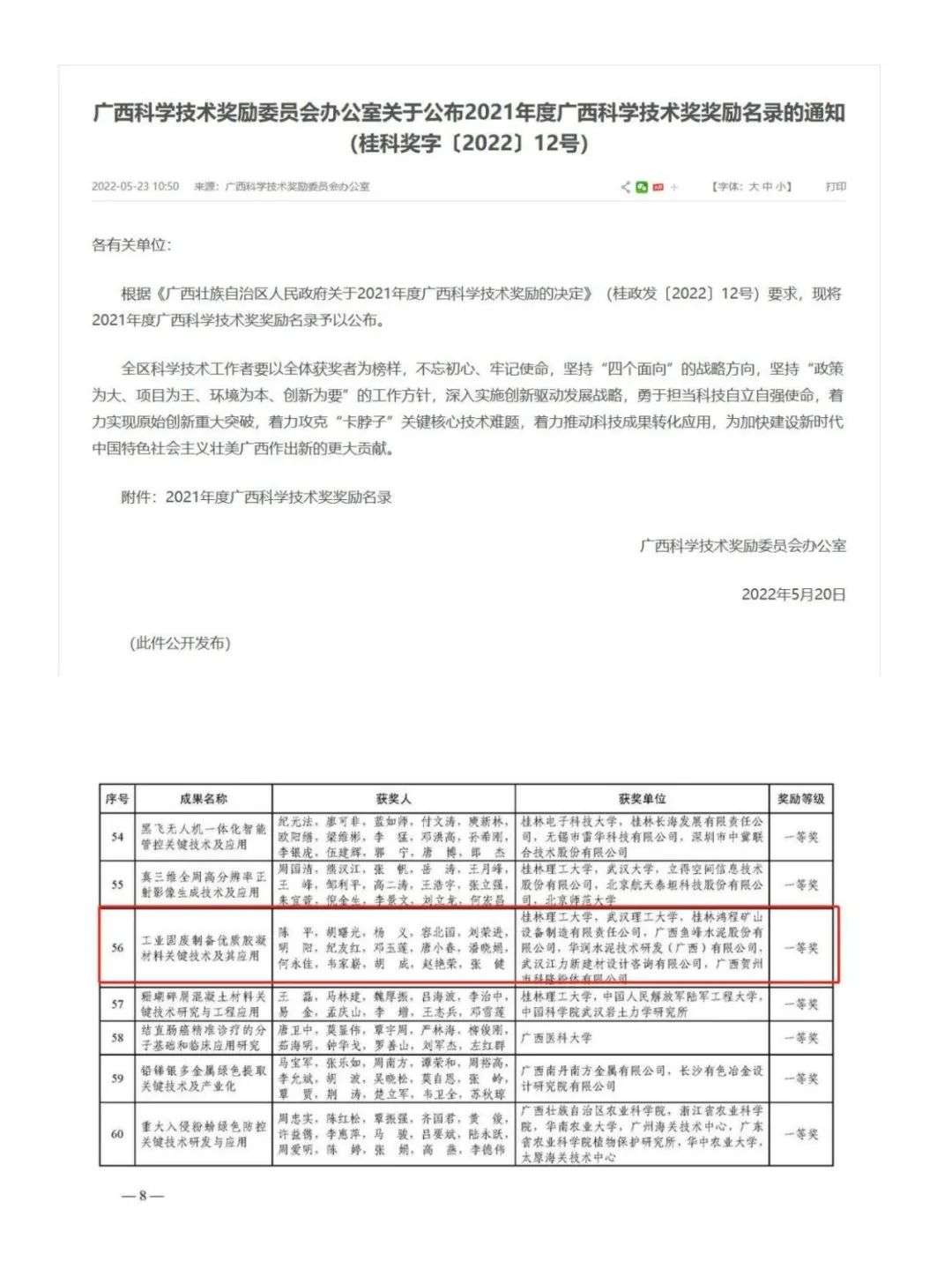 北部湾港集团旗下鱼峰集团好事成双,《工业固废制备优质胶凝材料关键技术及其应用》获得广西科学技术进步奖一等奖,《新型高抗硫酸盐性水泥研发关键技术及产业化》荣获科学技术进步三等奖。