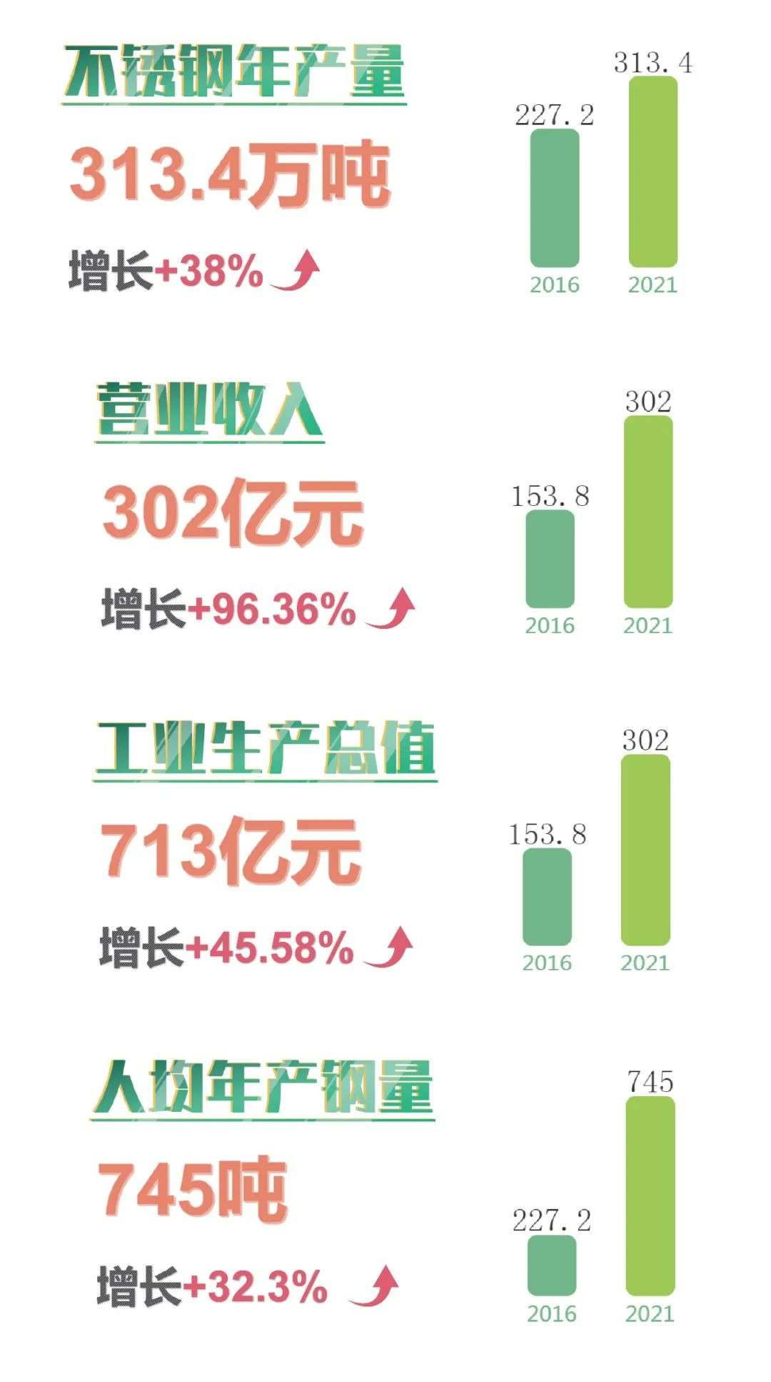 五年来,北港新材料人均产钢量由563吨上升到745 吨,不锈钢产量居全国第三,世界第四,产品市场占有率最高达17%。累计产钢量达1413.6万吨,销售收入1325亿元,上缴利税达到24.56亿元,实现了跨越式发展。