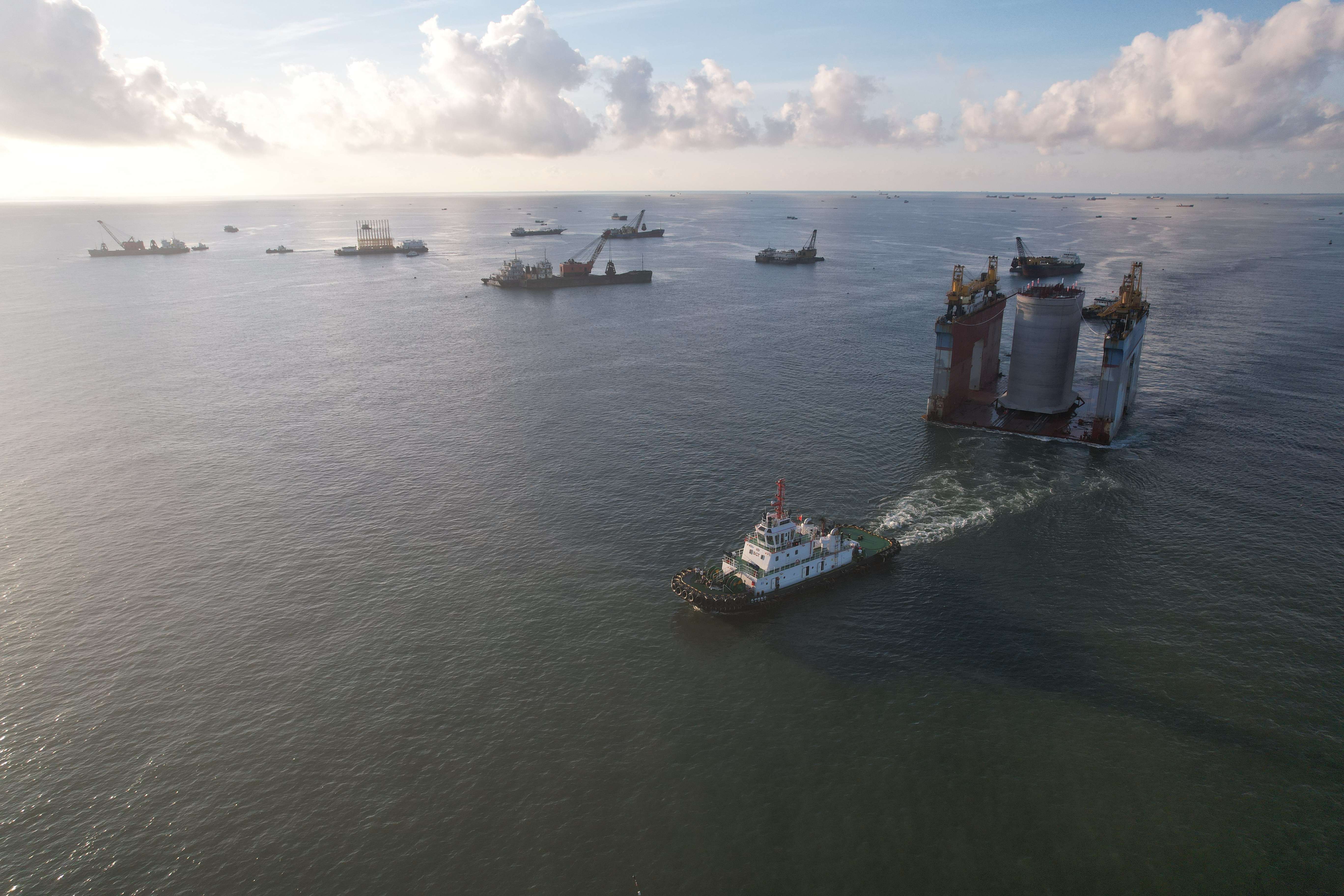 沉箱安装采用8000吨级半潜驳、5200匹拖轮及3000吨方驳配合进行,首次运用智能注水系统和可视化GPS定位系统等多项技术,填补了北部湾港口建设相关领域的技术空白。