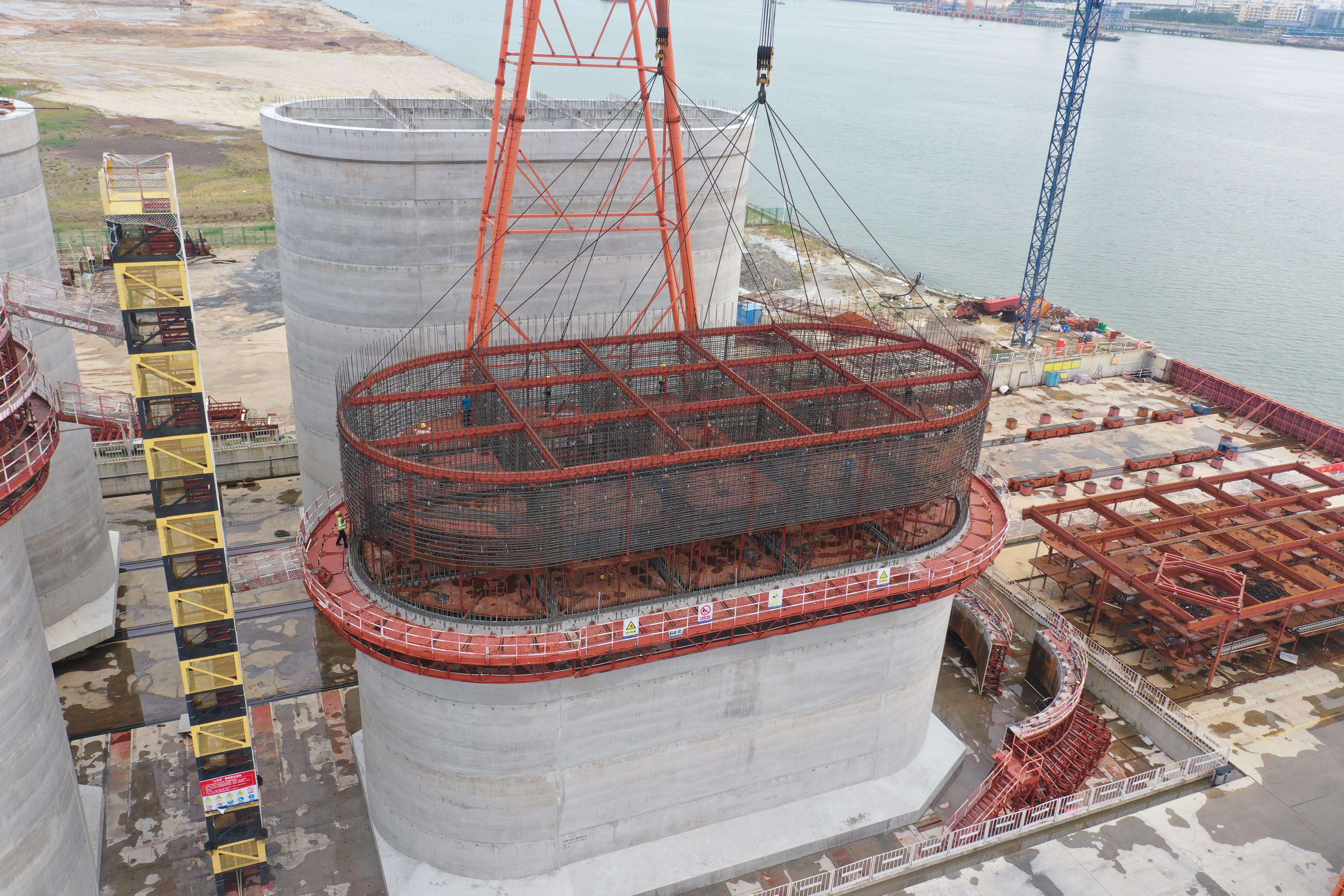 赤沙2号泊位工程作为北部湾港30万吨级散货单体泊位,沉箱采用重力式独立墩椭圆形结构。沉箱长29米,宽17.1米,高27.9米,共11座,单座沉箱重量超过5200吨,体量创下北部湾港历史新高,是名副其实的大吨位“定海神针”。