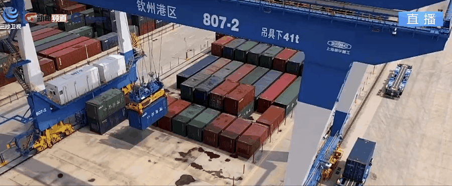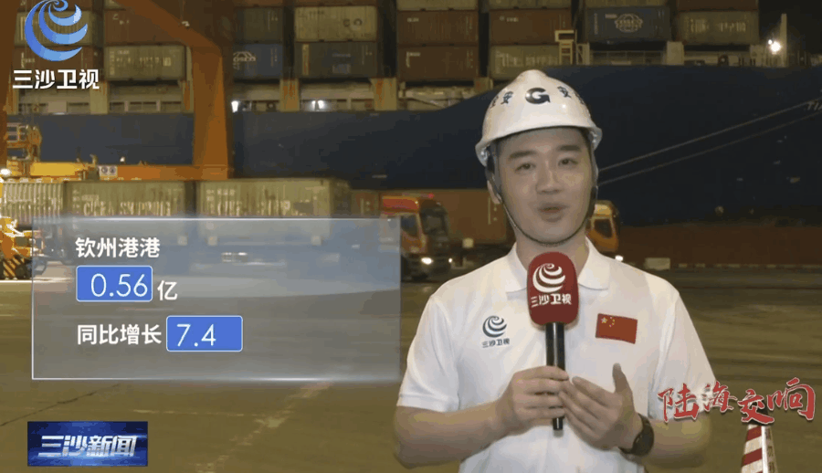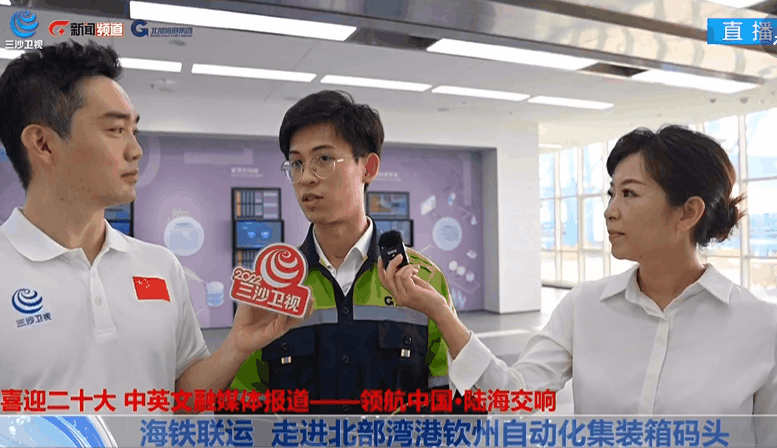 “我现在所处的是全国首个海铁联运集装箱自动化码头现场!9月20日清晨,‘天秀河’号从海南洋浦港出发,满载着远洋而来的货物,行驶在西部陆海新通道航线上,来到了我们现在所在的广西钦州港……”三沙卫视主持人栾子州现场报道。