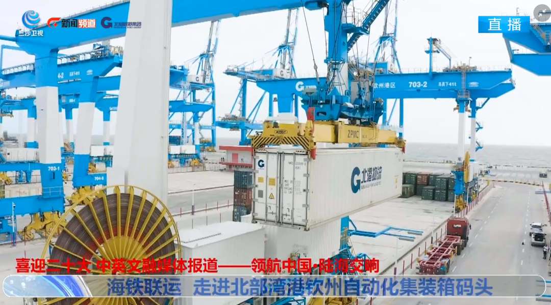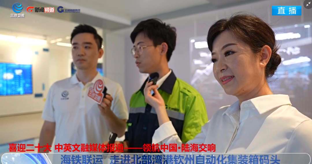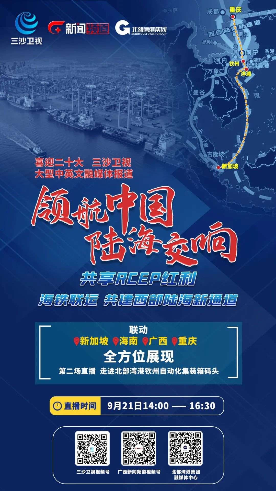 9月21日,海南三沙卫视大型融媒体报道《领航中国·陆海交响》走进北部湾港,直播聚焦全球首个采用“U”型工艺布局的钦州自动化集装箱码头。