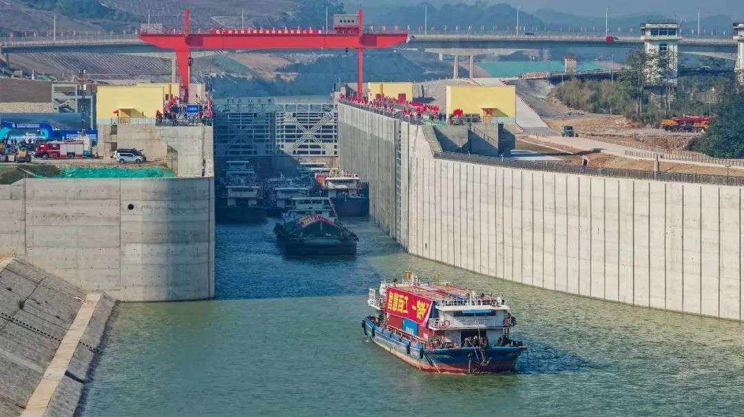 12月15日上午,数艘满载货物的货船在西津二线船闸完成泄水开闸后往下游缓缓驶去,广西西津水利枢纽二线船闸工程建成通航,西江航运干线将实现3000吨级双线船闸全面贯通,从此西江黄金水道的瓶颈打通,西江航道网络与平陆运河相接互连,为广西通江达海、向海图强奠定了坚实基础。