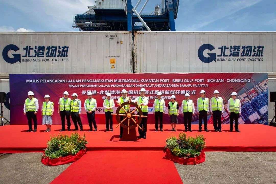 4月7日在关丹,自治区党委书记、自治区人大常委会主任刘宁和马来西亚交通部部长陆兆福,共同见证“关丹港—北部湾港—中国川渝多式联运航线”开通。