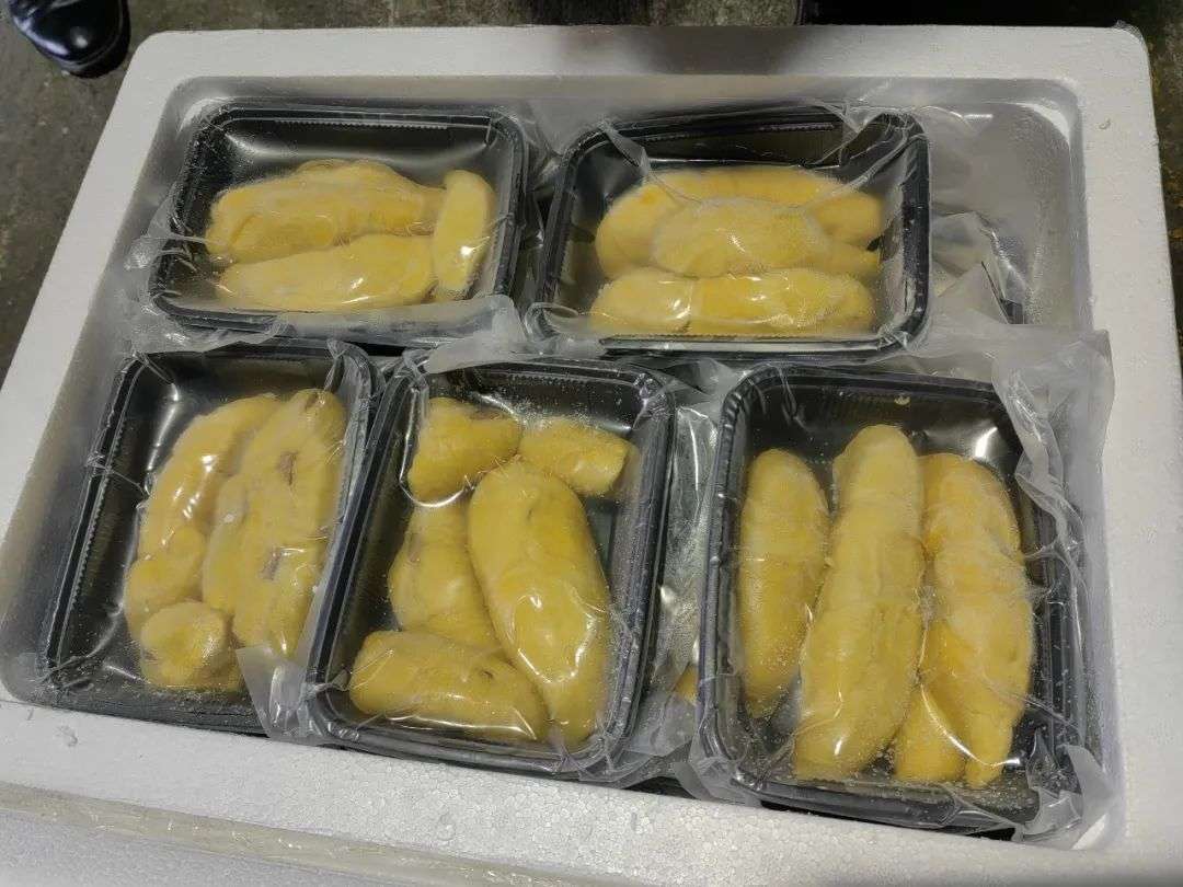 这批榴莲采用液氮冷却技术,冷柜全程冷链运输,历经2500多公里的运输,随机抽取开箱查验,包装内温度仍保持在最佳温度-20℃,果肉色泽金黄,香味浓郁扑鼻。
