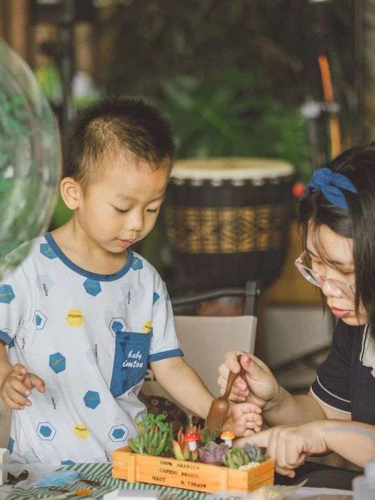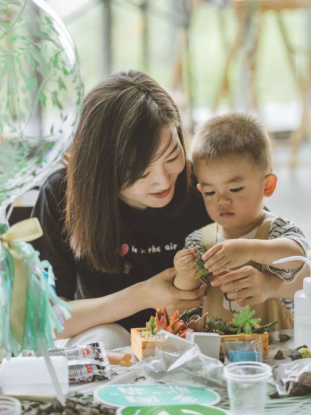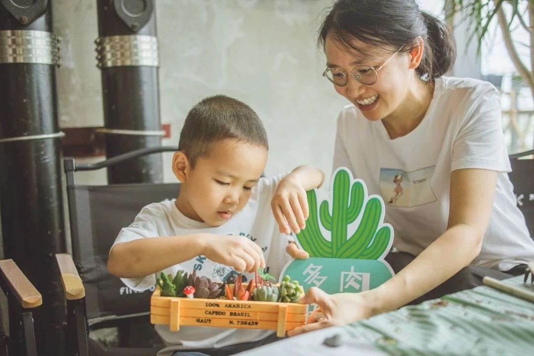 孩子们在爸爸妈妈的帮助下,把苔藓、多肉、砂石、卡通配件等材料装进容器里,在体验手工带来的均衡美感和奇思妙想的同时,创造出了一个个妙趣横生的绿色童话世界。