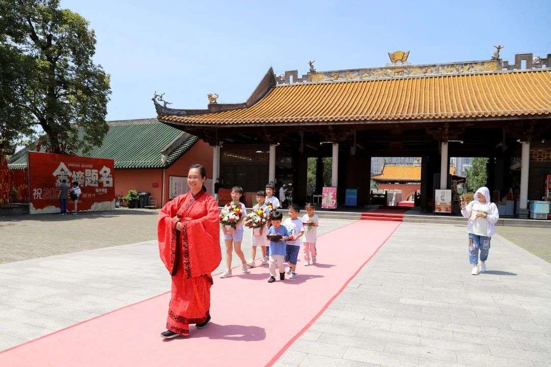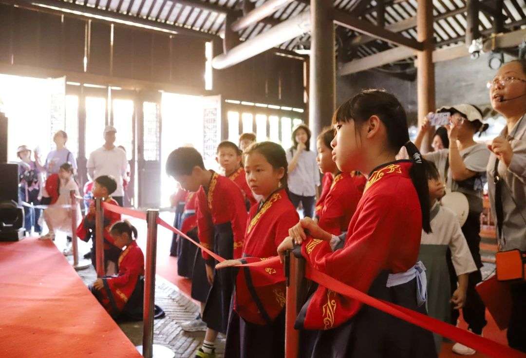 活动中,小朋友们身着汉服,列队迎礼、净手入庙,穿过“状元门”,在大成殿击鼓鸣志,礼拜孔像,完成“学子三献”,并在乡贤祠学习古礼、诵读《弟子规》《孝经》、学写书法“孝”字,身临其境体验中华民族传统文化的魅力。