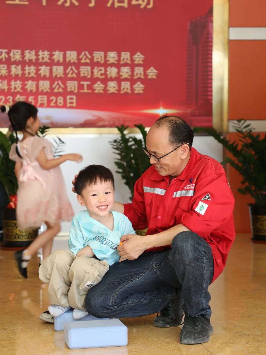 在华锡环科,孩子们在家长的陪伴下快乐地体验着“过河”“孩子带我回家”和“绘画比赛”等亲子游戏,在爸爸妈妈的亲密配合下,孩子们勇敢地往前冲。