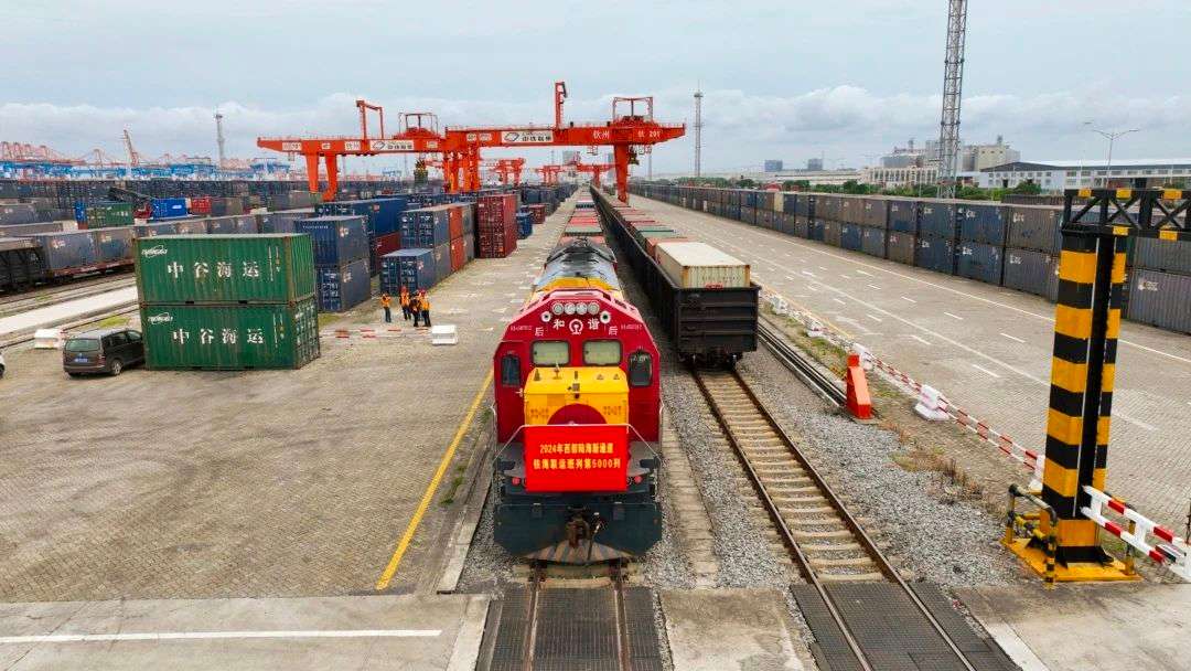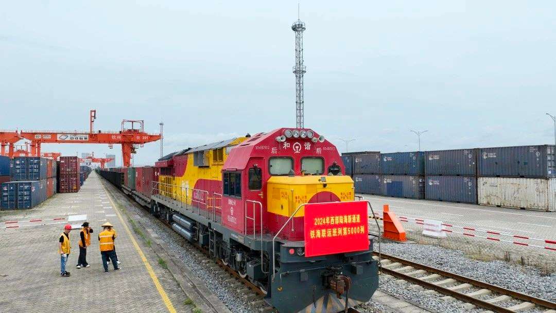 6月14日上午,一列满载着新加坡聚乙烯以及国内白云石、高岭土等102个集装箱的海铁联运班列,从钦州铁路集装箱中心站缓缓发出驶向重庆小南垭站,至此,2024年西部陆海新通道海铁联运班列已完成5000列,折合25万TEU(标箱),同比增长20.8%,这标志着上半年目标提前16天完成,为全年完成10000列战略目标任务奠定坚实基础。
